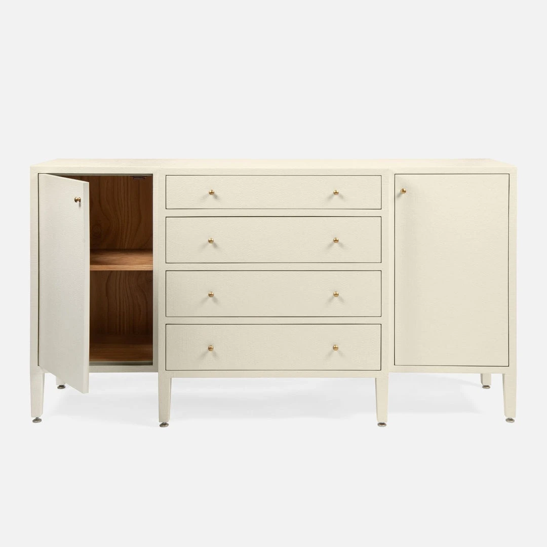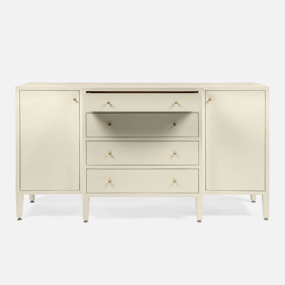 The Conrad Deep Drawer Buffet in Off White Faux Raffia from Made Goods is both long and dimensional. Combining design with functionality, the Conrad Buffet is the perfect addition to any space!