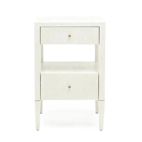 Made Goods Conrad Low Single Nightstand in Pristine white faux raffia offers a bedside table with stylish functionality. Square side tables like the neutral color Conrad provide storage and display surface for your lighting and decorative items. This modern contemporary design showcases clean lines, two storage drawers, brass knobs, an open shelf, and tapered legs. Ideally used in the bedroom, the Conrad could also be used as your sofa side table. *This item is handcrafted and may show slight variation in size from one piece to another.