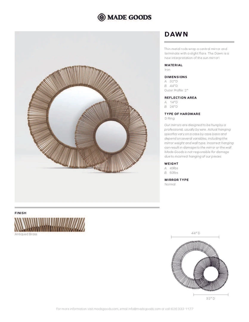 The Dawn Mirror in Antique Brass Large from Made Goods is the perfect addition to any home. Inspired by vintage design, the round contemporary Dawn mirror features metal rods that will create a modern look to any wall in your home or office. Wall mirrors like this beautiful reflective piece can be hung over a console in your entryway, over the credenza in your office, or over the vanity in your bathroom.