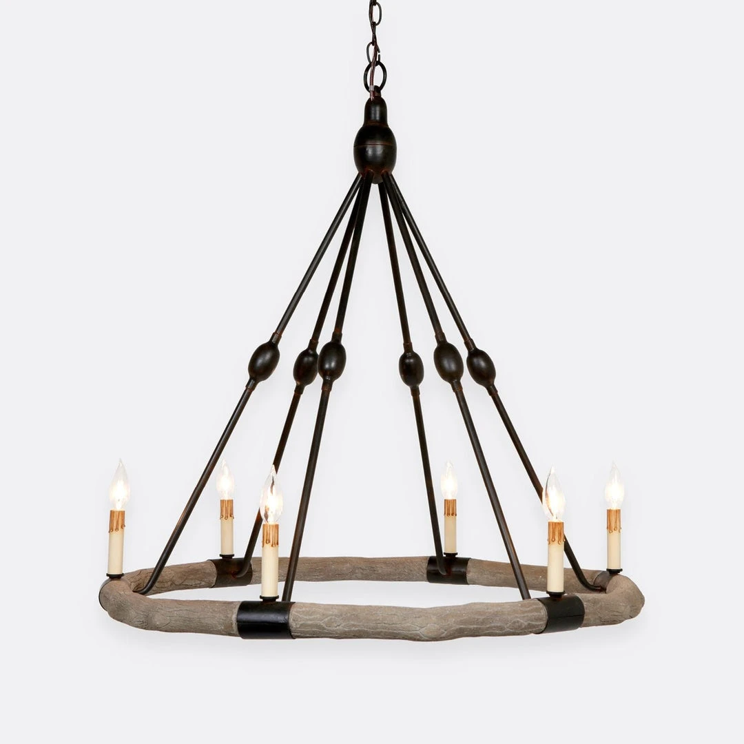 The Dean Chandelier in Gray and Black in small from Made Goods features a faux bois circle that is the support for six chandelier lights anchored to a natural iron base. Iron also creates decorative support. The Dean Chandelier is a classic light and makes a statement in entryways, bedrooms, and offices alike.