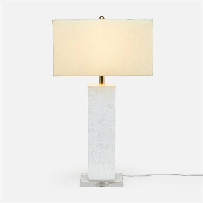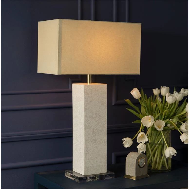 Delicate material meets ancient techniques with the Della Lamp in White Lacquered Eggshell from Made Goods. The exquisite look of the Della features cracked eggshell creating an intricate one-of-a-kind pattern painted and encased in resin. This column-shaped lamp is quite the conversation starter. Place the Della on entryway consoles, on either side of the sofa or at the bedside for chic style.