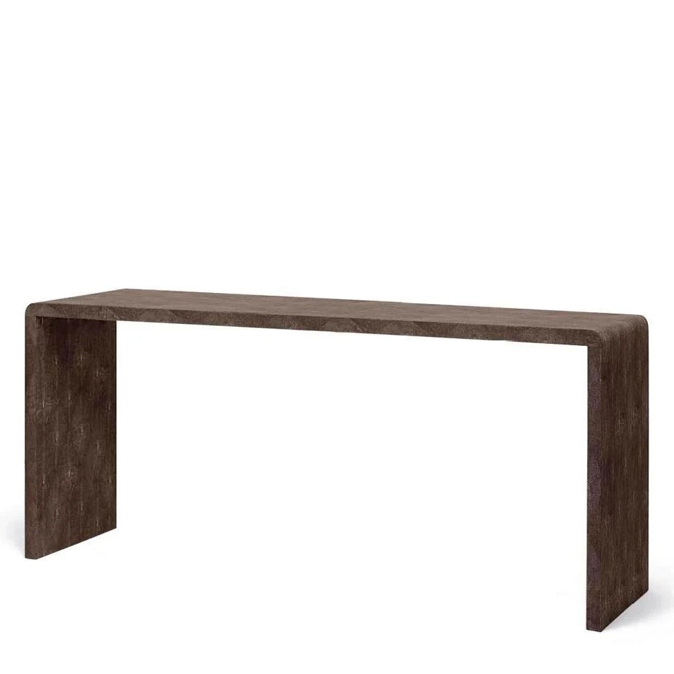 Made Goods Harlow 72″ Console in Dark Mushroom faux shagreen reflects a waterfall design, the ultimate in free floating console tables. Shaped in a rectangle design, a versatile console table like the Harlow can be used in the entryway, as a bar, or as a sofa table. *This item is handcrafted and may show slight variation in size from one piece to another.