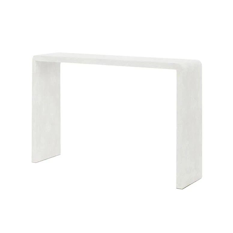 Made Goods Harlow Narrow Console in Blanc faux shagreen features a waterfall design with curved edges. Consider using this simple yet elegant console table as a sofa table or as a bar. Console tables like the Harlow, with their soft, rounded edges exude chic sophistication. *This item is handcrafted and may show slight variation in size from one piece to another.