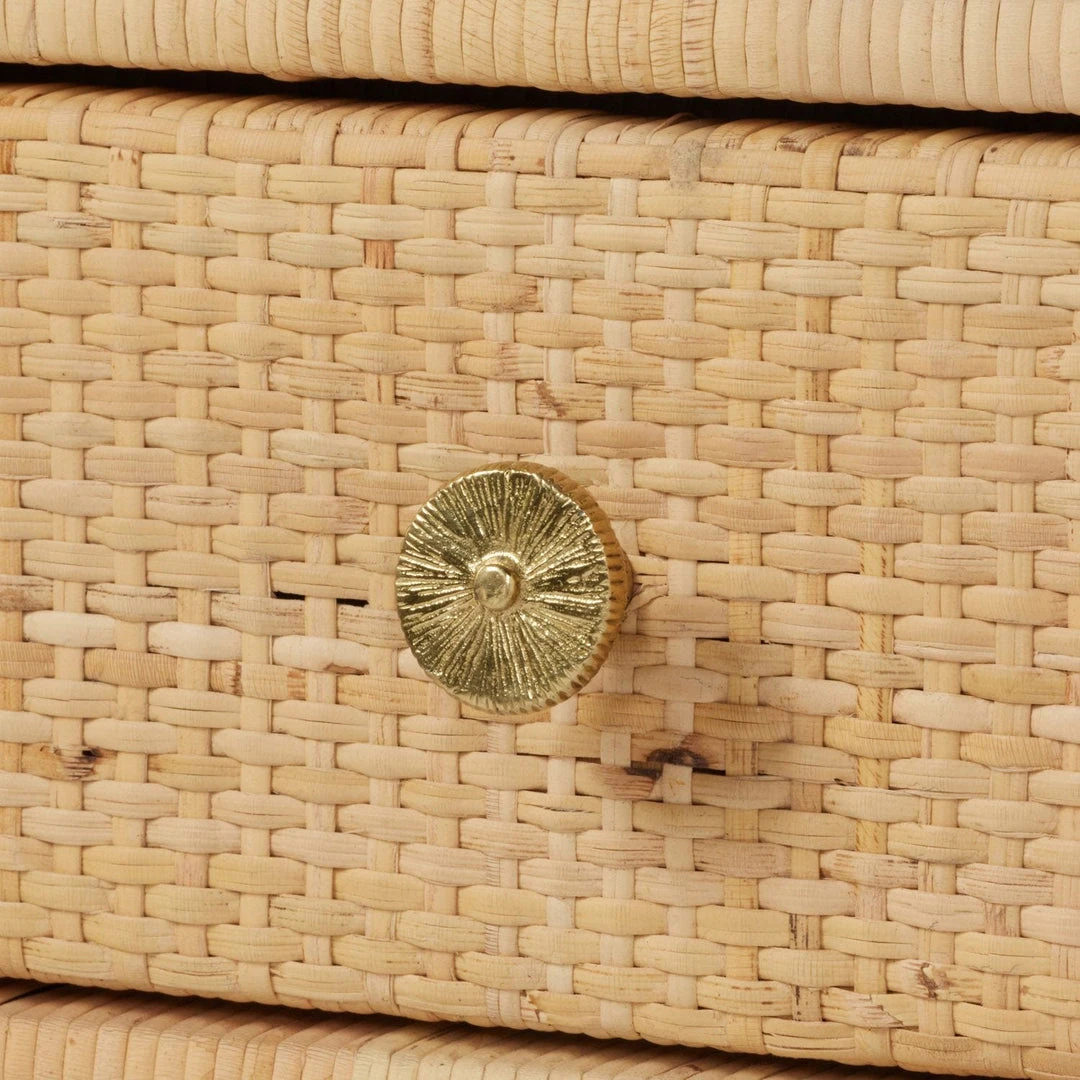 The Isla Open Shelves Desk in Natural from Made Goods features a tightly-wrapped, natural peeled rattan frame, with slender legs reinforced by a box stretcher, which supports an expansive, densely woven basketweave top. A piece of glass protects the material against the spills and stains of daily life. Soft-close front drawers with flower-patterned gold knobs, finished with a stained wood interior, offer storage for office necessities.