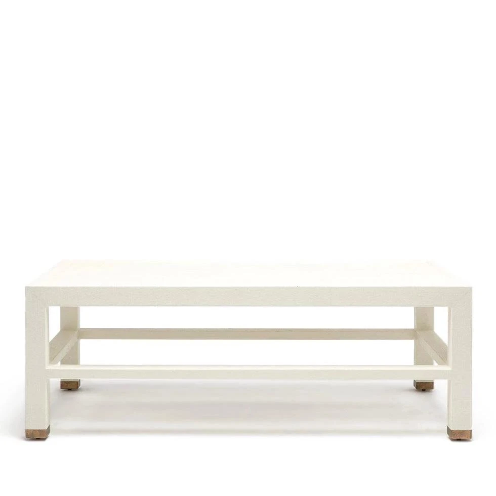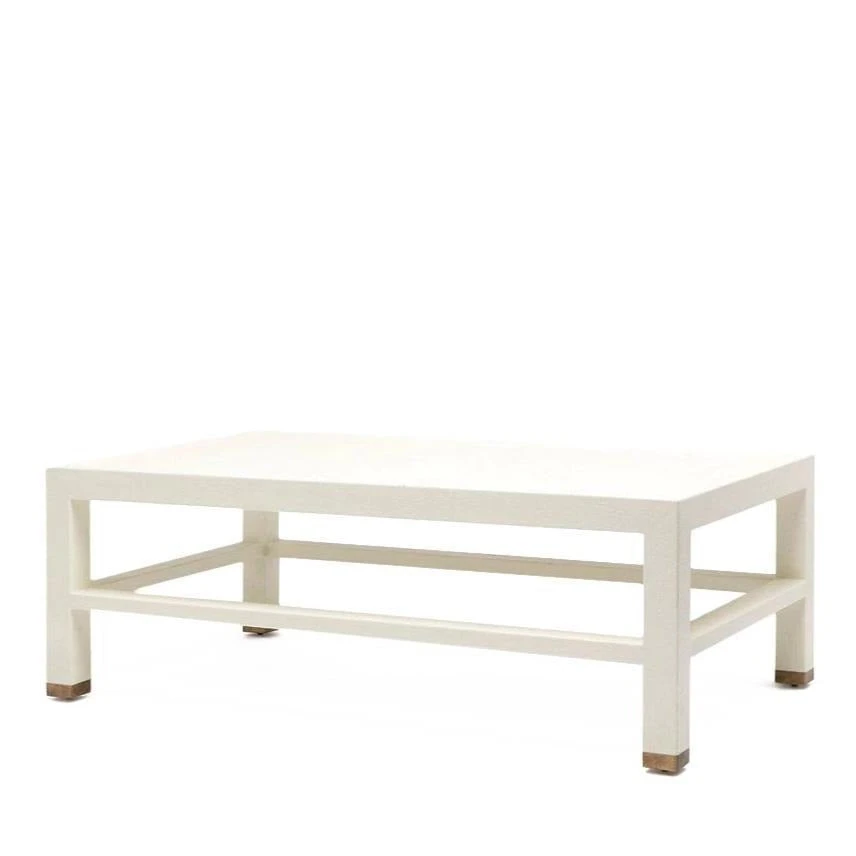 The Jarin Coffee Table from Made Goods features a rectangle base covered in white Belgian linen. Â The texture and sheen of material are highlighted on the fully finished furniture. Â The Jarin table works well in all rooms with its open-air base and brass capped feet.