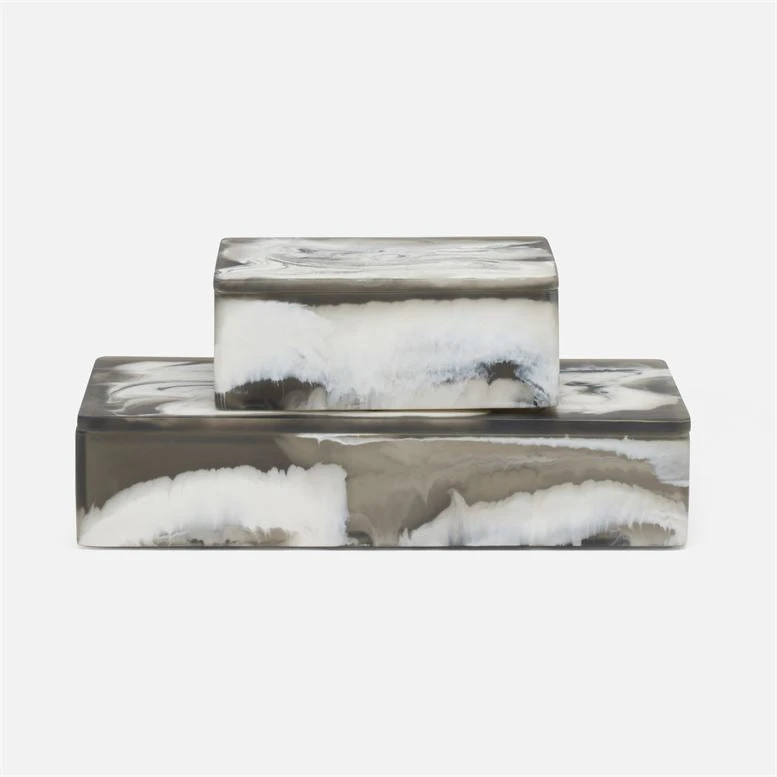 Mesmerizing patterns emerge from our Osias Box Set in Black from Made Goods. This luxurious box set is crafted from swirled resin. These versatile rectangular boxes are topped with fully removable matching swirled resin lids. Place the Osias boxes in the office on the desk, at the entryway, or on shelving to store all your essentials in style. *Set of two.
