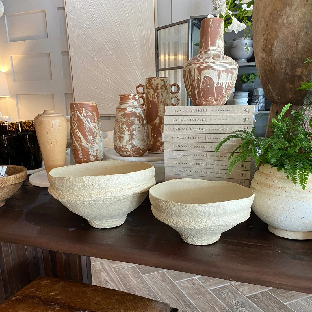 The handcrafted Tadeo Bowl Set of Two from Made Goods is the perfect touch for bringing personality to coffee tables, dining tables, and shelving throughout the home. The Tadeo footed bowl is made of paper mache and adds a perfectly imperfect touch to any vignette.
