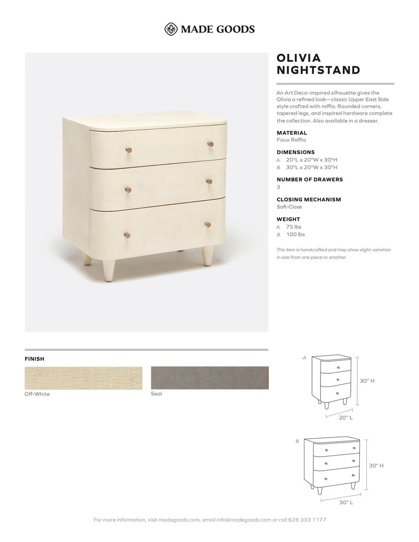 Made Goods showcases an Art Deco-inspired silhouette with the Olivia Double Nightstand in Off-White Faux Raffia. This piece features a refined look with a nod to classic Upper East Side style. The Olivia is wrapped in faux raffia with rounded corners, tapered legs, and inspired brass hardware. Place the nightstand in bedrooms or consider this striking piece in the office or living room as a side table with functional and stylish storage options.