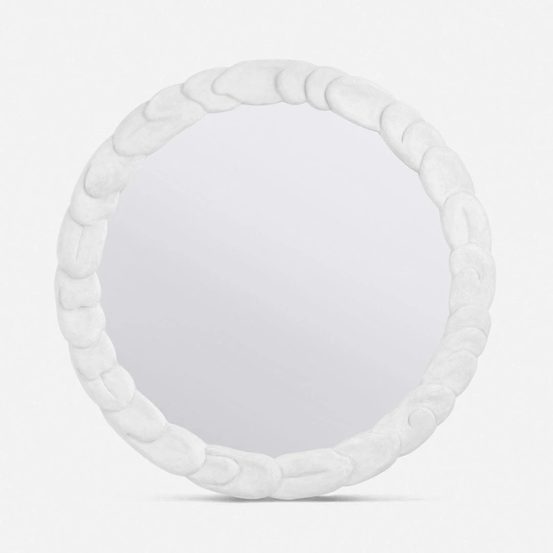 Featuring Irregular, overlapping disks that create an original take on the Paulina Mirror in White Plaster from Made Goods. The Pauline Mirror is handmade, finish and organic shape give subtle warmth to an unexpected material. *Handmade, never mass-produced, and built to withstand varied elements and temperatures.