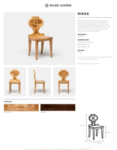 Inspired by the small decorative chairs in Sweden’s antiques history, the Rikke Chair in Olive Ash Veneer from Made Goods is an accent chair that doubles as a work of art. The embellished back is instantly iconic, and the olive ash veneer gives it an heirloom-quality look and feel.