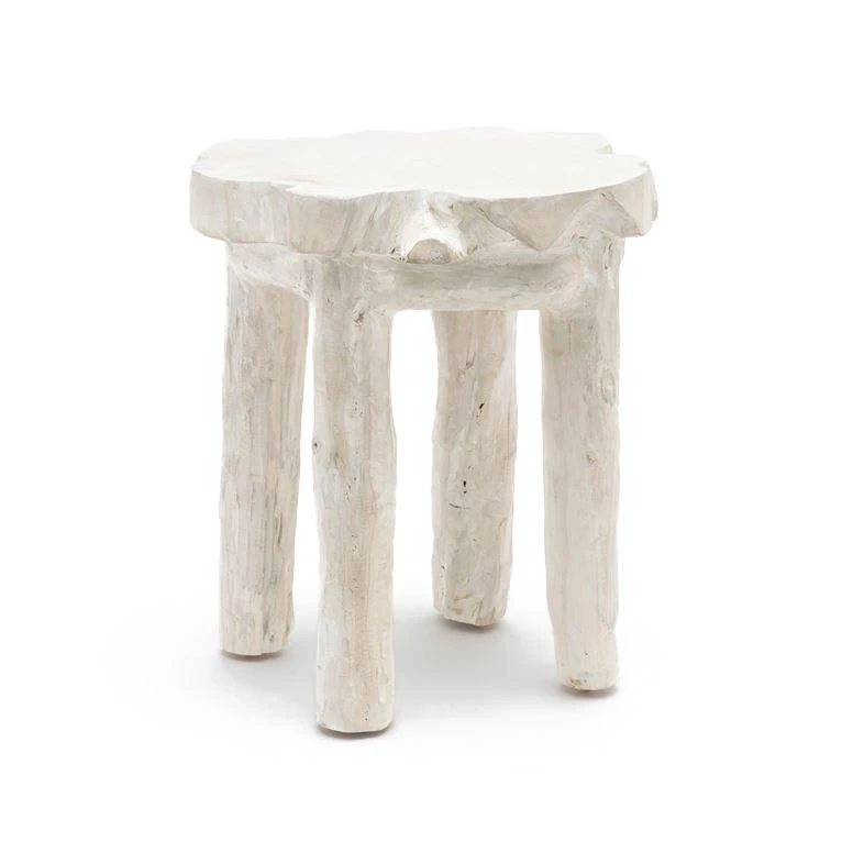 Whitewashed teak wood and sliced root create the abstract shape of the Royd Stool from Made Goods. Hallmarked by its individuality, this piece is as much an artful accent as it is a functional stool. Abstract shaping is to be expected, as are natural cracks and marks. This unique piece is easily stored under a console as needed.