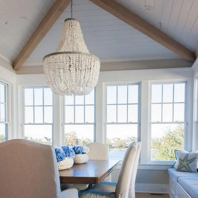 Made Goods Silvana Chandelier in White Shells and Silver Metal offers a casual, yet formal light, reminiscent of relaxing days at the beach. Ocean inspired chandeliers like the contemporary Silvana can be used throughout the home, particularly as foyer chandeliers and dining room chandeliers.*As seen in Traditional Home magazine.