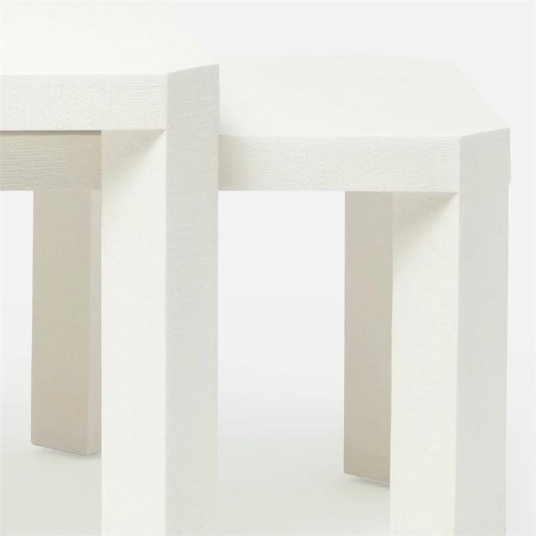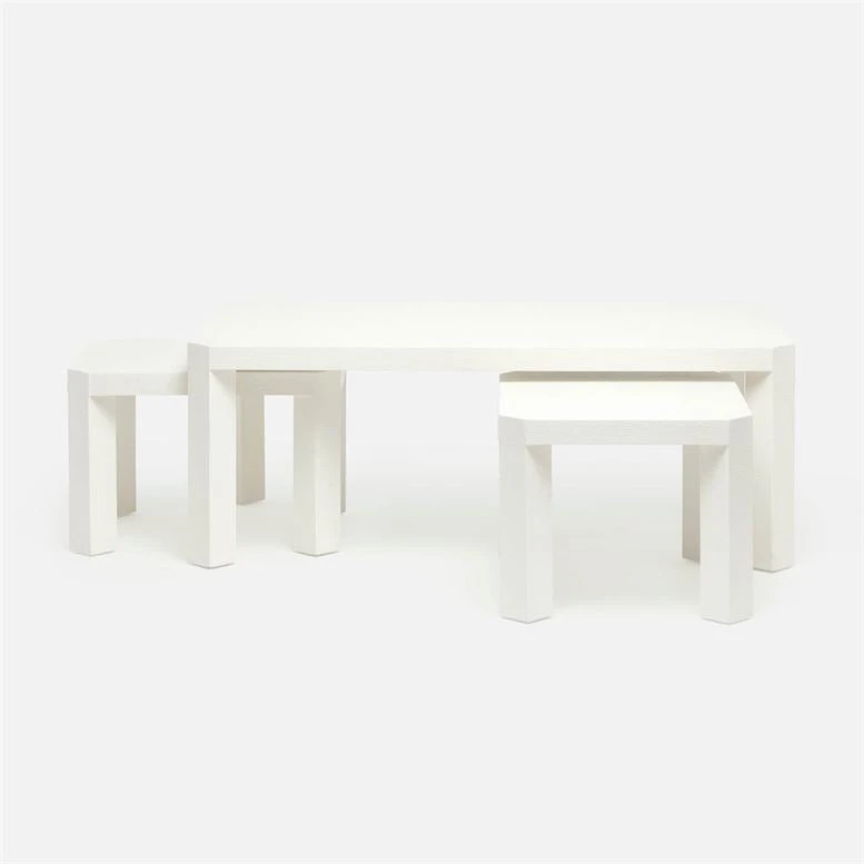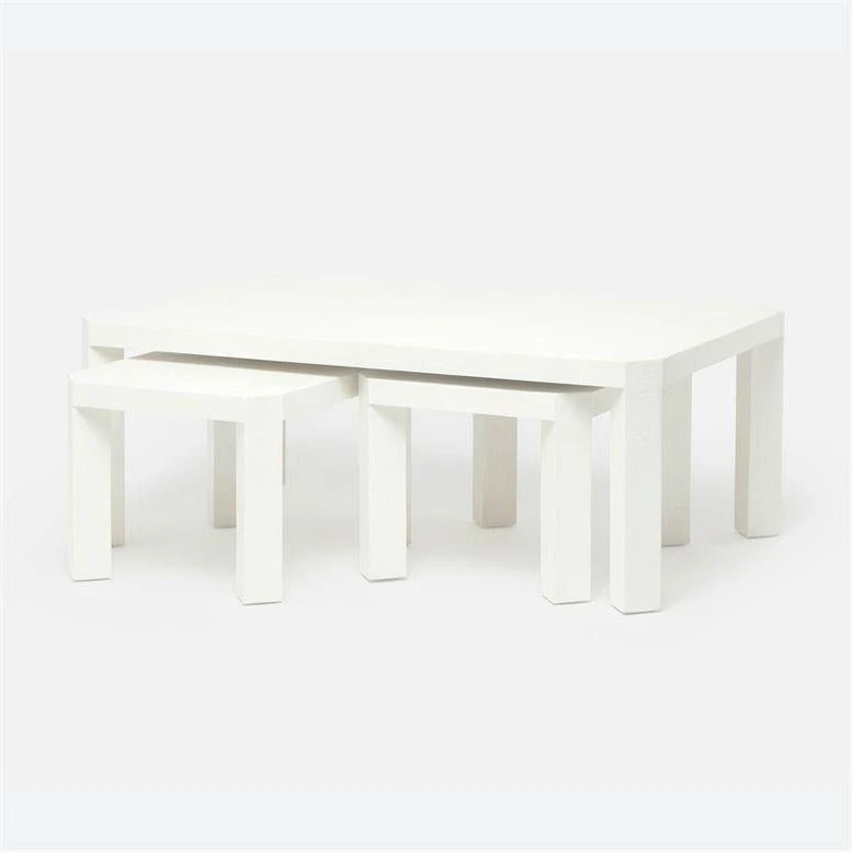 Simple, clean, and incredibly versatile, the Taylam Nesting Coffee Tables in Pristine from Made Goods offer just the right amount of surface space wherever it’s needed. Covered entirely in faux raffia, this large cut-corner table,with two smaller add-ons, is the epitome of texture and modernity.