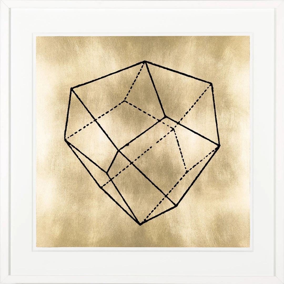 The Krystalle 3 Gold Leaf from Natural Curiosities is a study in abstract form and was inspired by an entry in German encyclopedia “Meyers Konversation Lexicon,” which showed various manmade crystal shapes. The images in this particular artwork have been silkscreened onto a gold leafed field, creating a beautiful minimalist design.