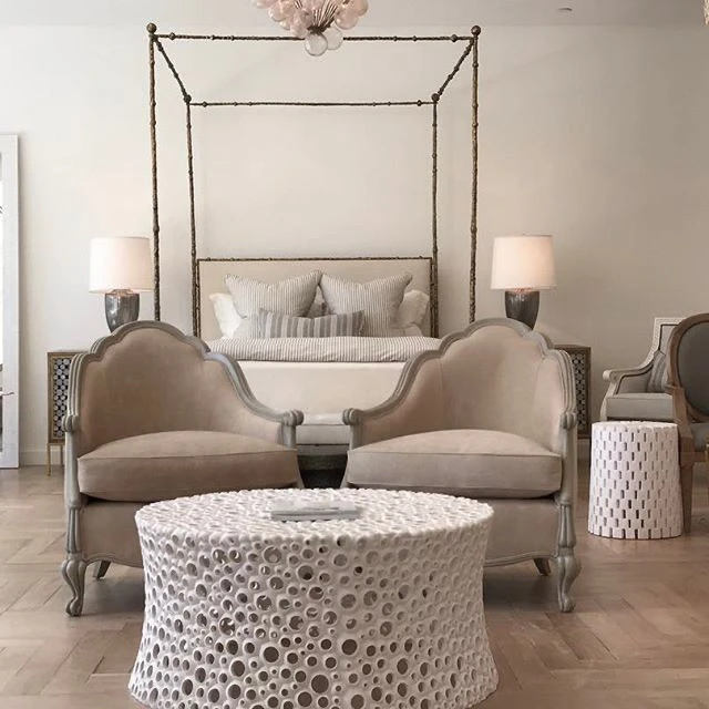 The Meri Cocktail Table in White presented by Oly Studio is a stunning example of a chic design that weaves texture over texture. The Meri is handcrafted by artisans from pierced white resin in intricate circles adding a whimsical nod to this unique accent table. The Meri is the perfect statement piece for living areas and office environments alike.