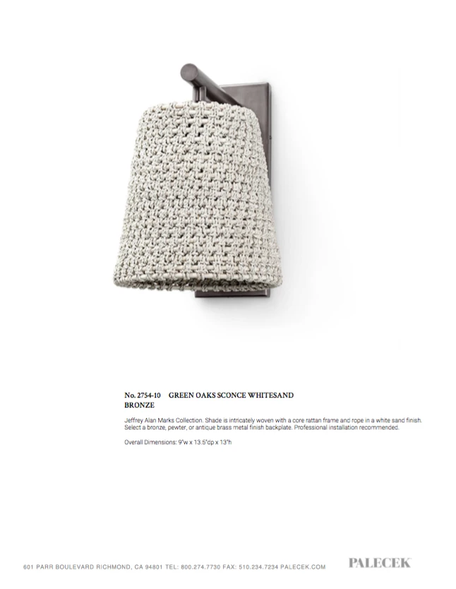 Palecek presents the Green Oaks Sconce in Whitesand and Bronze, delivering coastal chic style to your home. Designed by Jeffrey Alan Marks, the shade is intricately woven with a core rattan frame and rope in a whitewashed finish. This sconce is beautifully displayed in multiples for hallways, bathrooms, and living spaces alike. *Professional installation recommended.