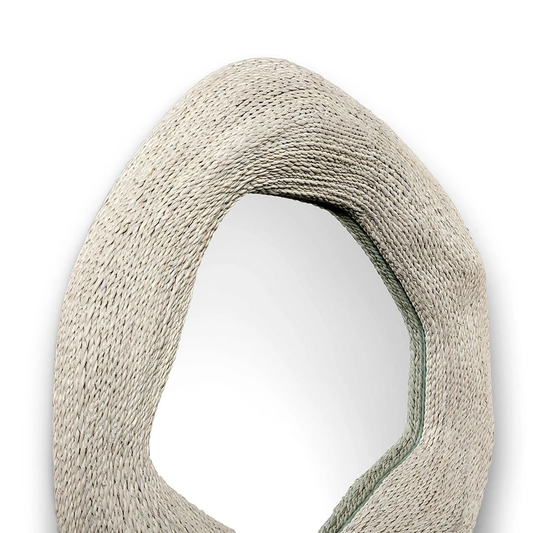 The Jaden Mirror in Small from Palecek features lampakanay rope in a white-wash finish. This asymmetrical shaped mirror is hand-wrapped over a sculptural metal frame. The Jaden Mirror is the perfect addition to any room. *Mirror includes metal hangers for mounting in two directions.