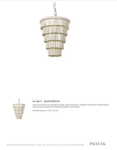 The Juliet Pendant Small from Palecek delivers elegant coastal style to your home. The Juliet is crafted from natural coconut fiber tiles attached to a powder-coated metal frame. Completed with an off-white finished chain and canopy hanging kit, the Juliet creates a dramatic statement in living spaces, bedrooms, and offices alike. *Professional installation recommended.