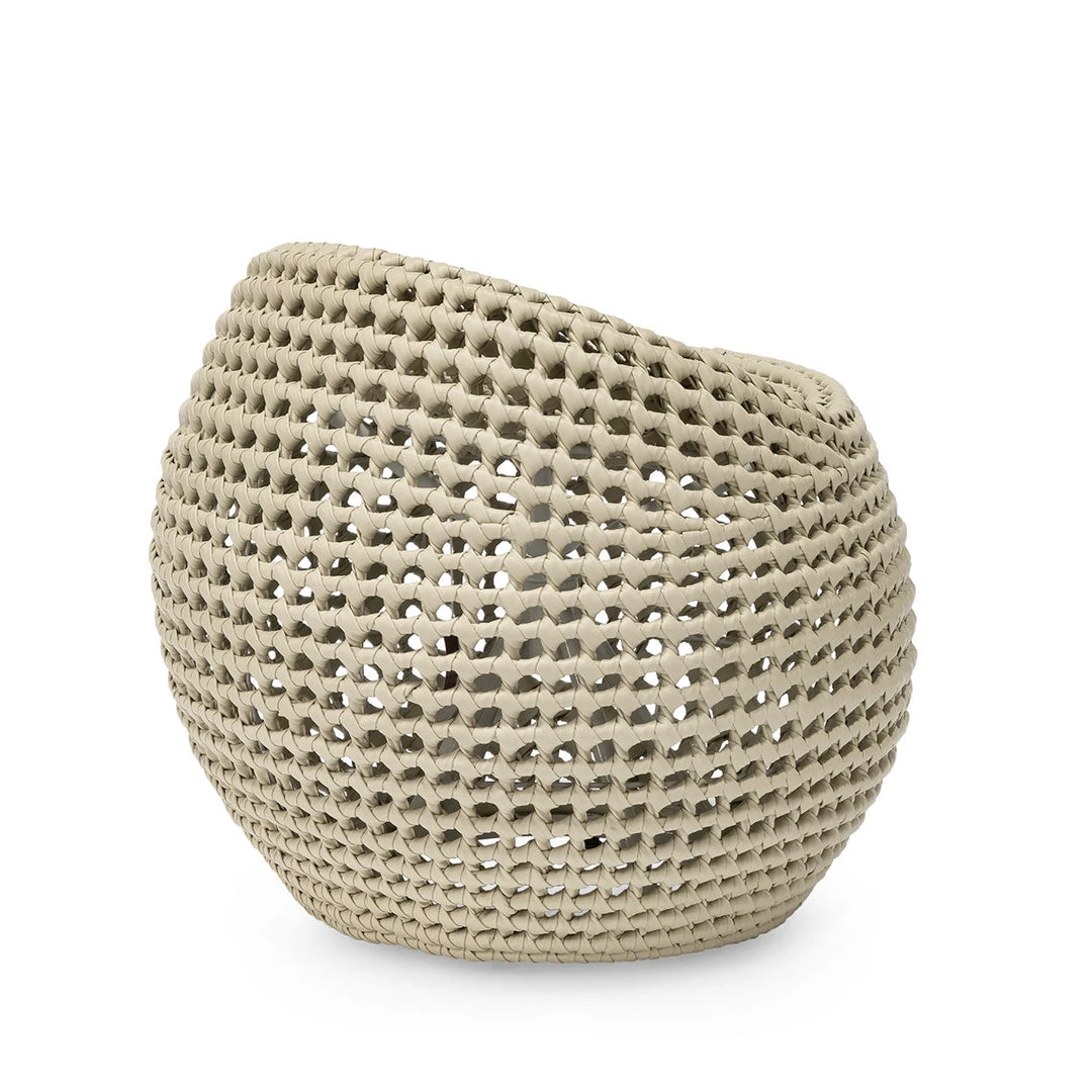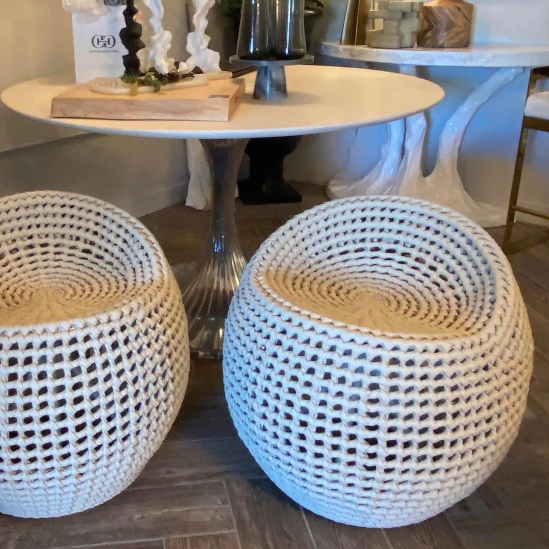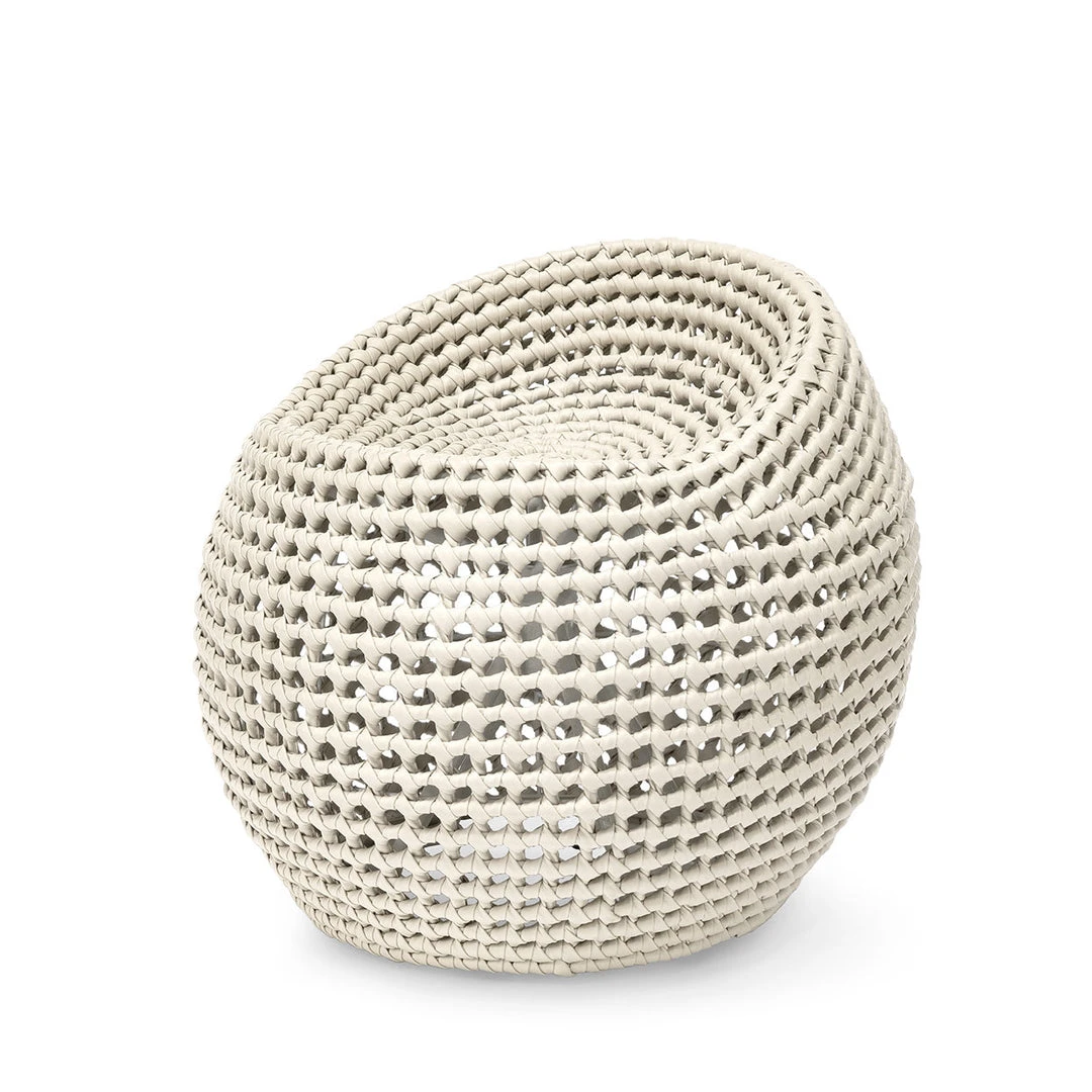 The Manhattan Ivory Swivel Chair from Palecek features Ivory vinyl weaved over a metal frame featuring a 360-degree swivel mechanism. This versatile seat is perfect for adding a touch of designer style to indoor and outdoor spaces alike.