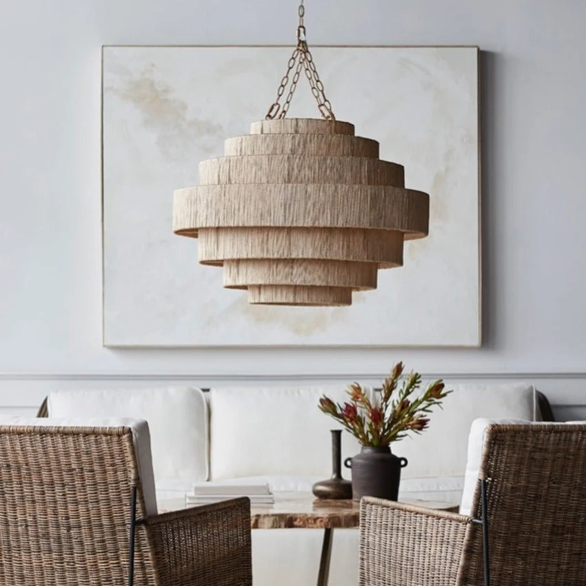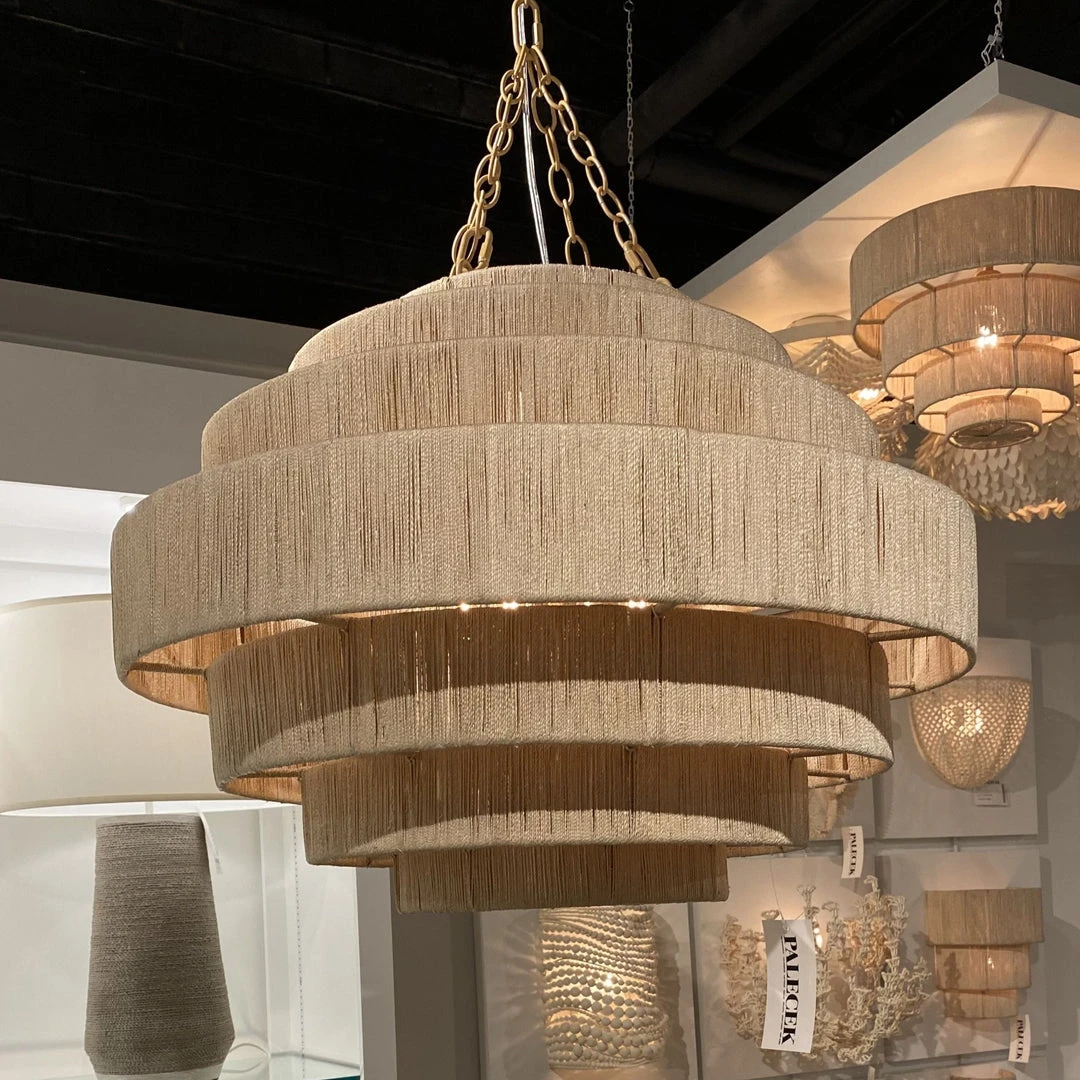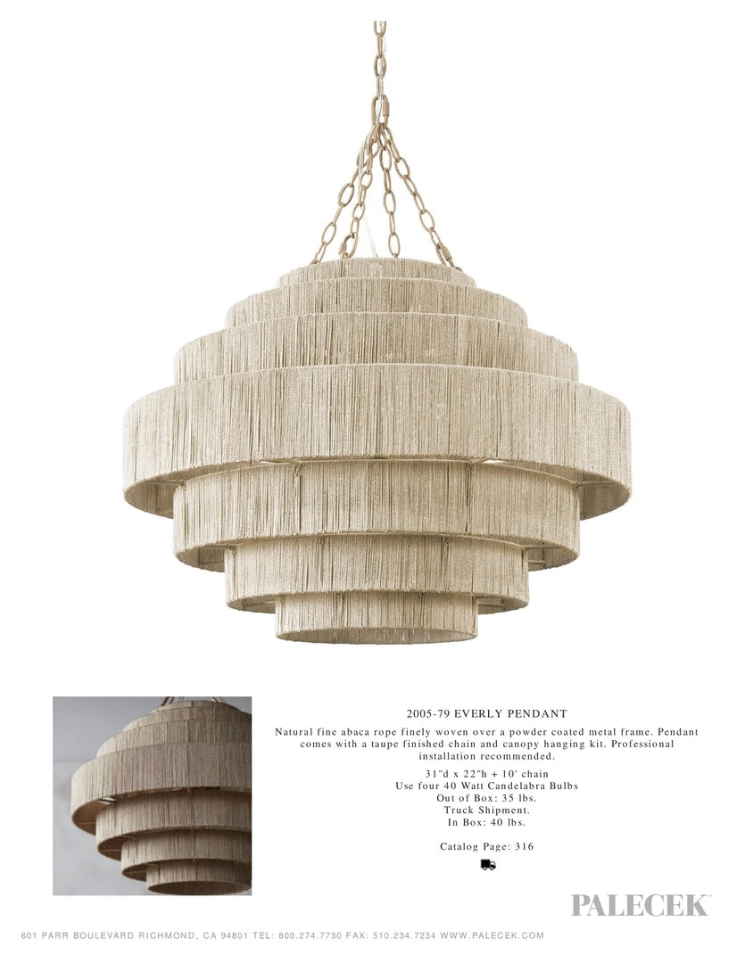 Natural fine abaca rope finely is woven over a powder-coated metal frame. The composition of the rope allows for light to shine through creating a soft and unique glow. Place the Everly in dining spaces, entryways and master suites for an eye-catching, elegant look. *Professional installation recommended.