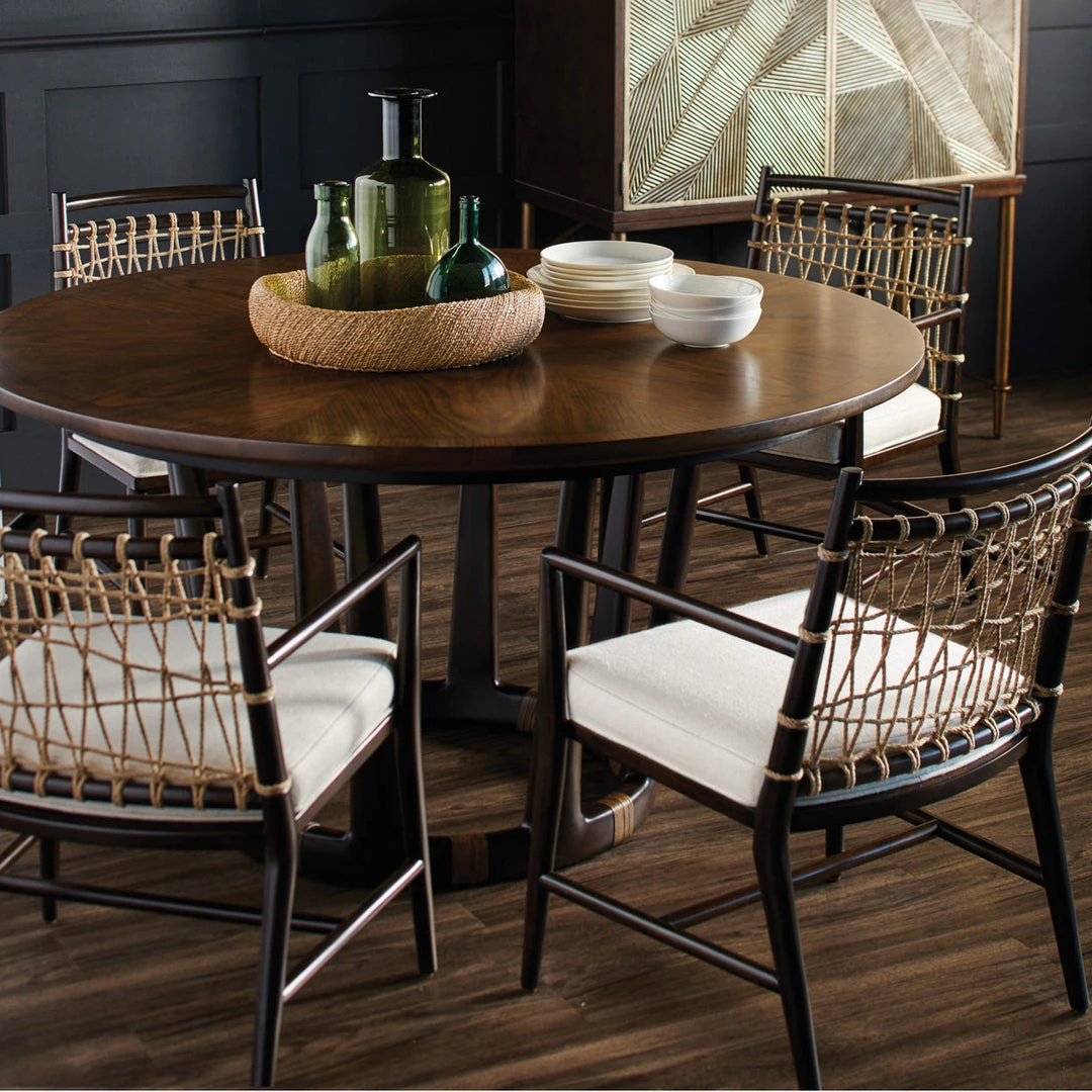 The Pratt Arm Chair, designed by Kirk Nix exclusively for Palecek, features a plantation hardwood frame and legs in a dark espresso finish featuring natural jute rope in an open weave pattern. The Pratt comes with a fixed upholstered seat in Oyster Hopsack upholstery.