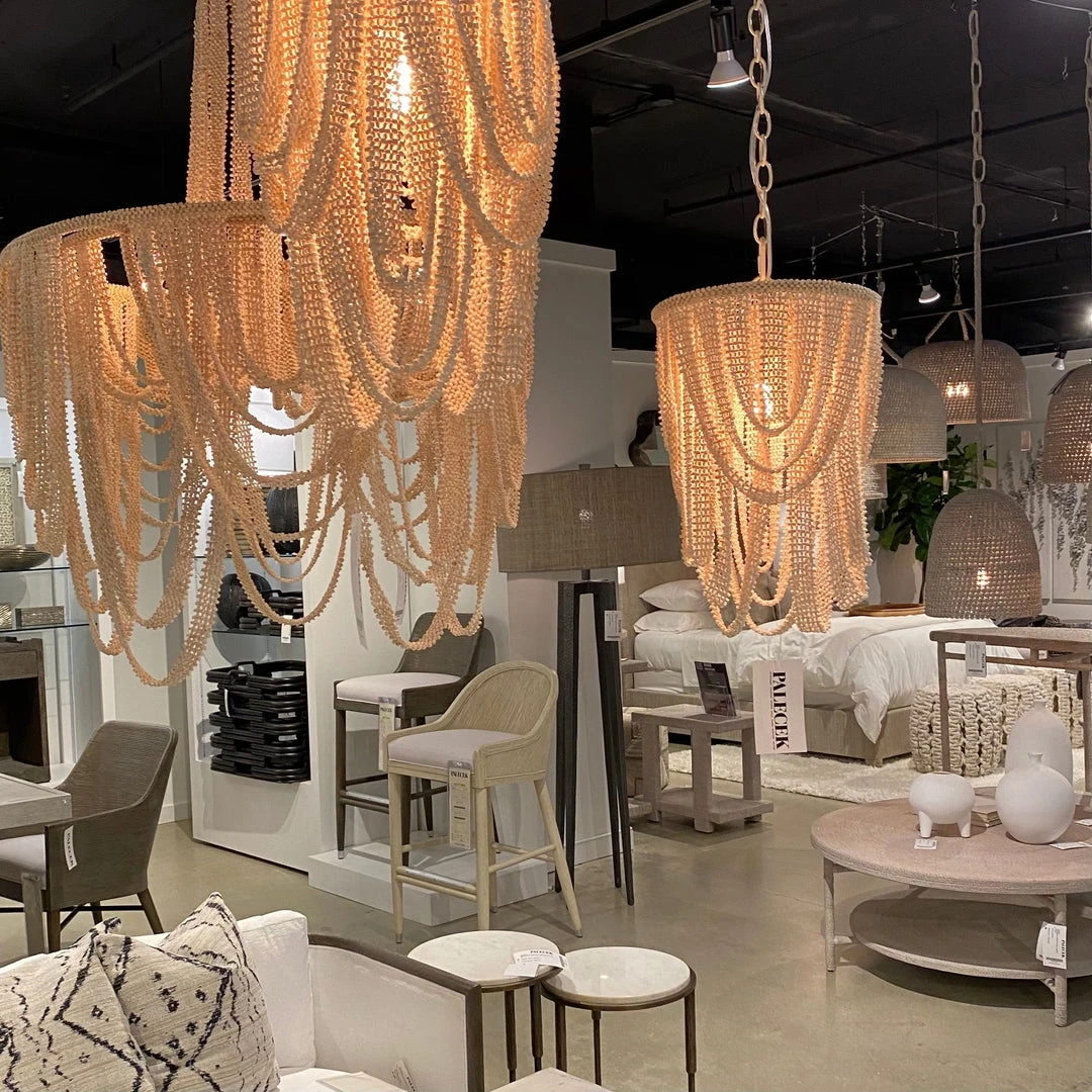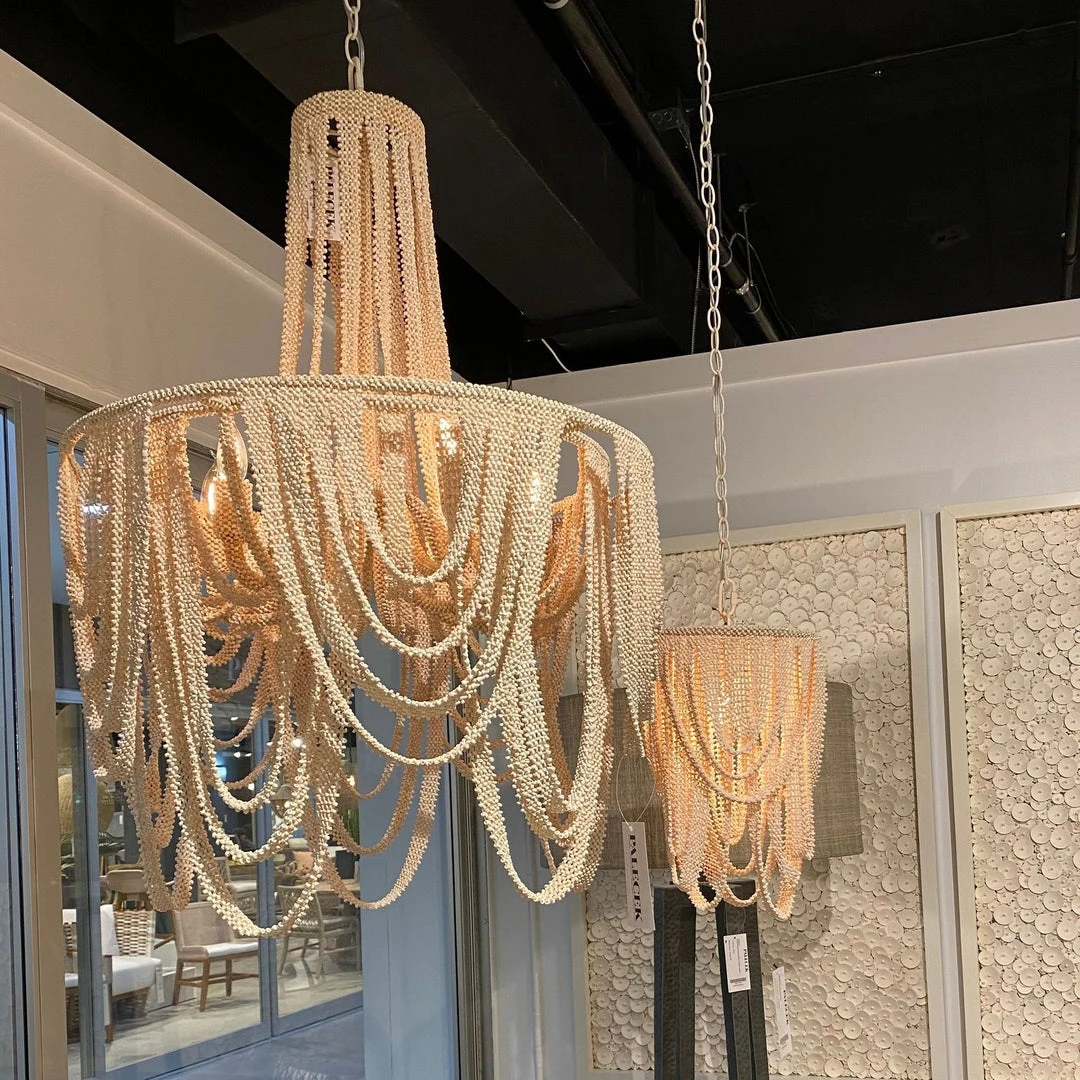 Palecek presents the Selita Pendant from Palecek, capturing a breezy and elegant coastal vibe for your home. This elegant pendant features tiny coco beads hand-sewn into draping ribbons, suspended from a powder-coated metal frame. The Selita comes with a cream finish chain and canopy hanging kit. Place the Selita in dining spaces, entryways, and master suites for easy elegance. *Professional installation recommended.