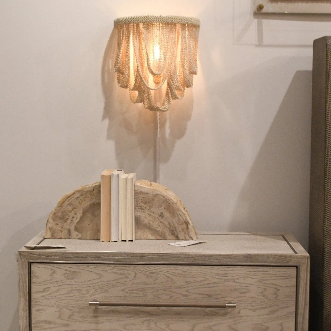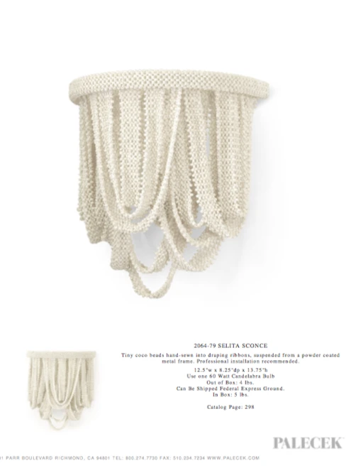 The Selita Sconce showcased by Palecek features tiny coco beads hand-sewn into draping ribbons, suspended from a powder-coated metal frame. This elegant sconce is exquisitely made and brings a soft coastal vibe to your home decor scheme. The Selita is the perfect wall light for hallways, entryways, or for either side of the fireplace mantle. Pair with the Selita Chandelier for a complete designer look.