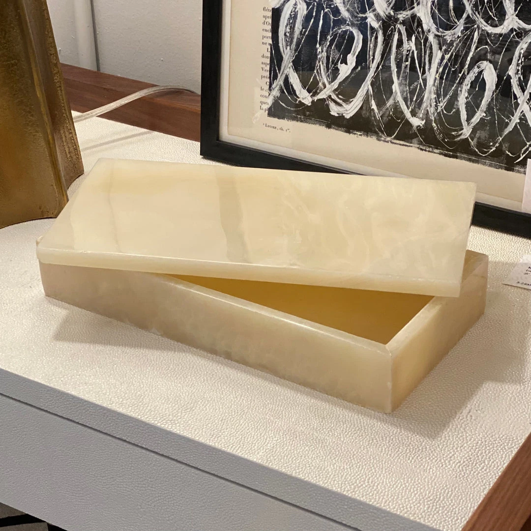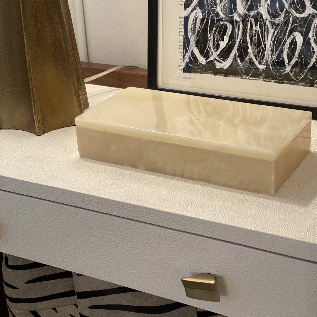 The Dizier Onyx Box in Large from Pigeon and Poodle delver a luxurious accessory for your home or office. This large box features a completely removable top and beautiful gradations. Perfect for storing essentials on the desktop, entryway or bedside.