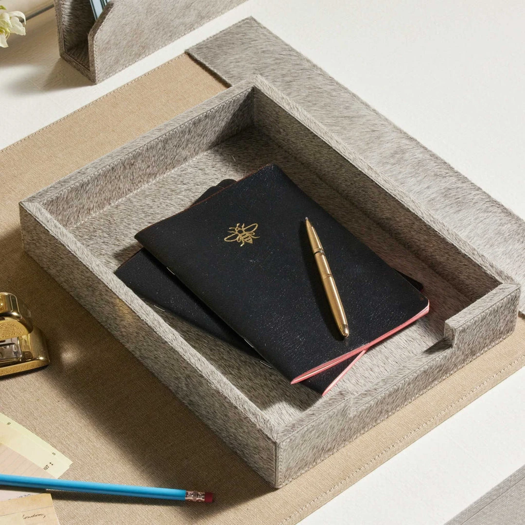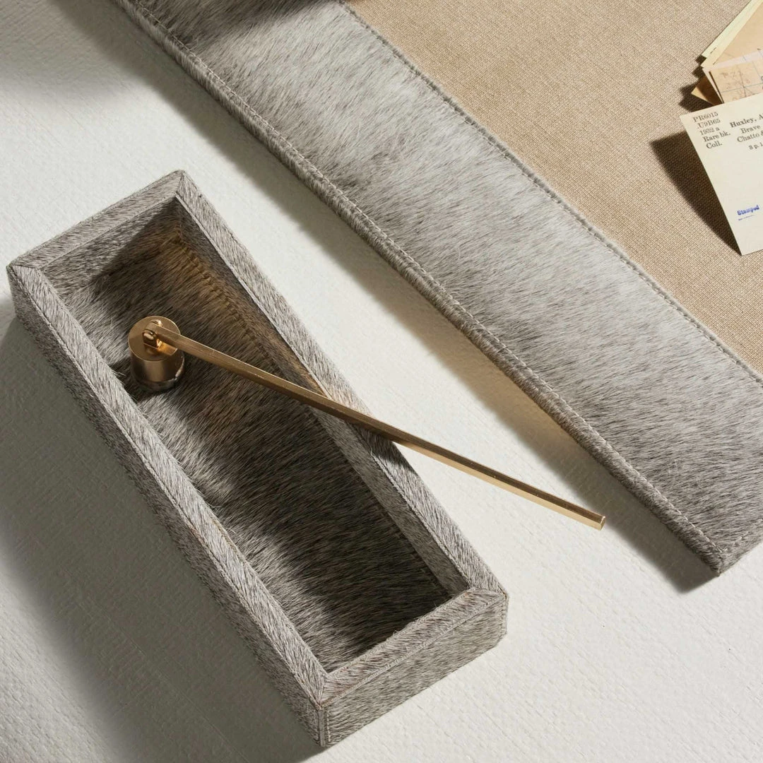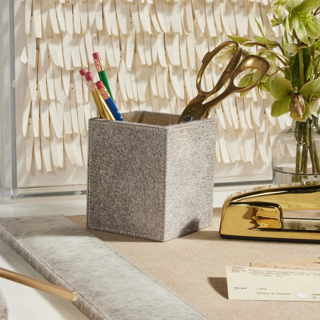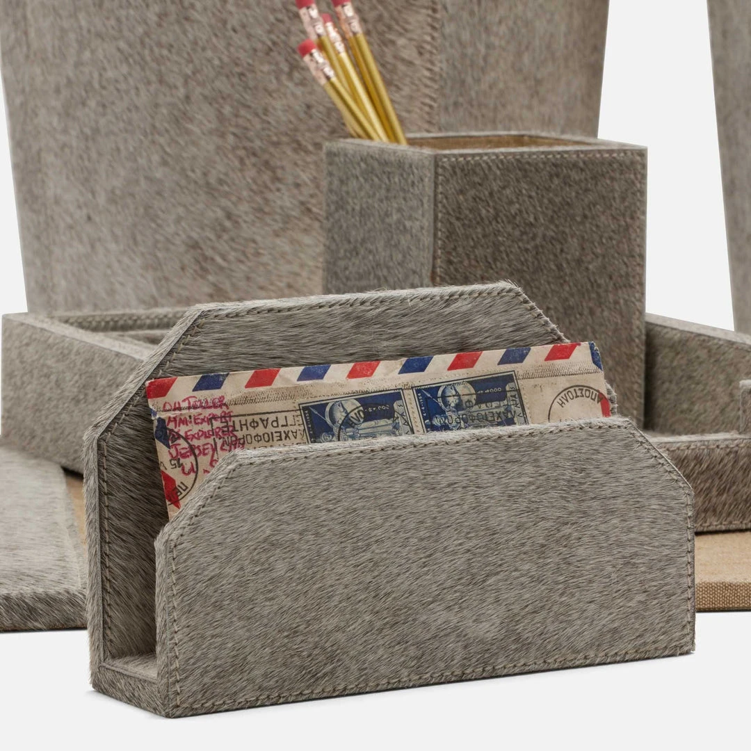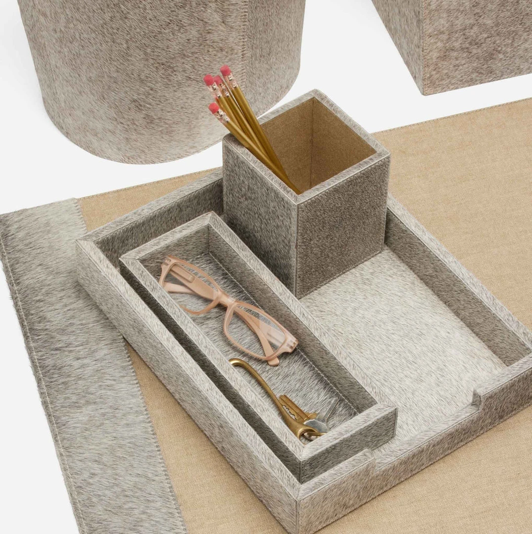 The Hyde Accessory Set in Gray Hide from Pigeon and Poodle features hair-on-hide leather paired with a subtle combination of texture and color that brings worldly masculinity to the stateliest of studies. This four-piece set works beautifully on any desktop or console. Pair with the Hyde Wastebasket for a complete look.
