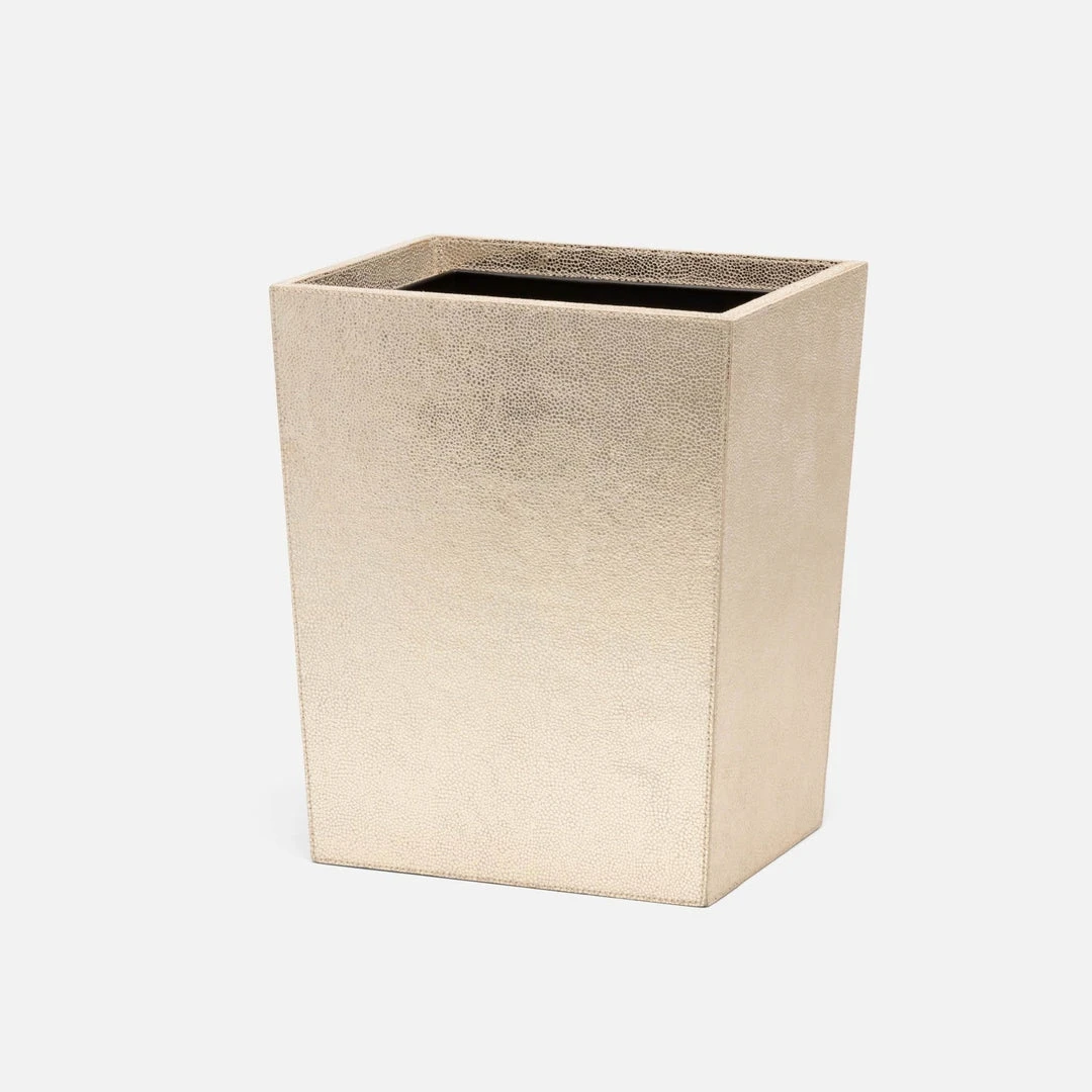The Viana Wastebasket in Gold Foil Leather from Pigeon and Poodle features spotted gold foil on full-grain leather delivering a piece that will dazzle any den or awe any office. Pair with the Viana Accessory Set for a complete look.