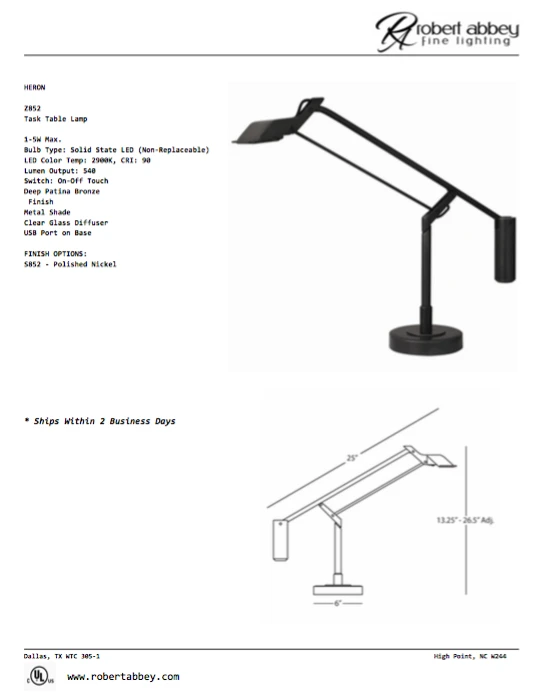 The Heron Table Lamp from Robert Abbey is sharp and sleek featuring a touch sensor dimmer on the shade and a convenient USB port on the base of the table lamp. This table lamp is beautifully balanced with an adjustable arm and counterweight.