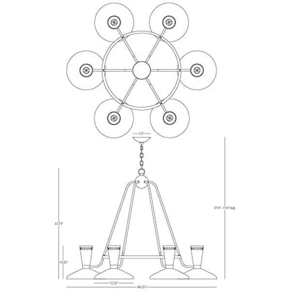 | Materials | Matte Black Metal Shades; Shade Top 4" Wide x 4" Diameter; Shade Bottom 12.125" Wide x 12.125" Diameter; Shade Down Side 10.125"; Canopy 5.5" Wide x 5.5" Diameter; Number of Bulbs 6; Bulb Type A; Direct Wire;Chain Length 36"; Chain Quantity 1 |