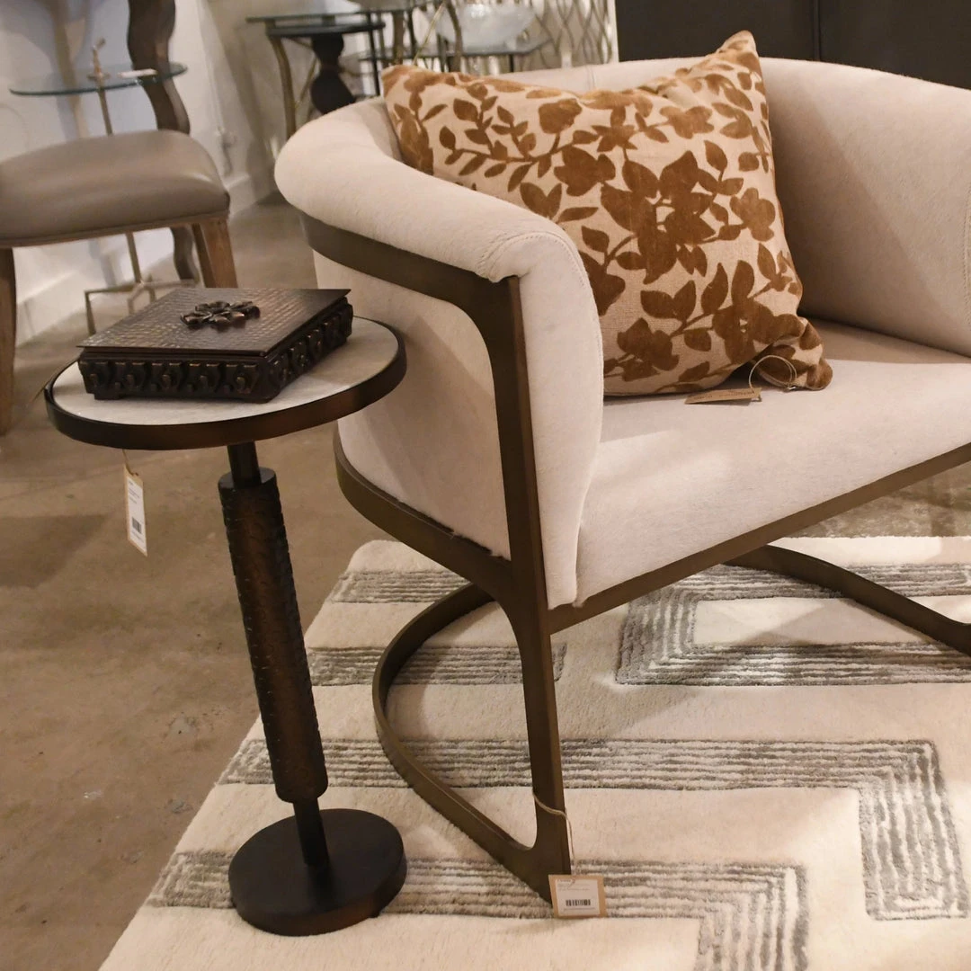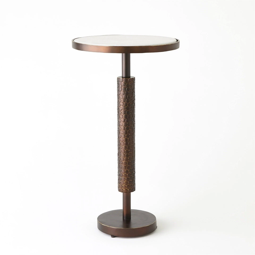 Beautifully textured with a pebble-like pattern, the Hammered Martini Table in Bronze with White Marble from Studio A furniture brings glamorous style to your home. Featuring an iron base with antique bronze finish and a sleek, white marble top, this versatile accent table works well in living spaces as a just right surface for entertaining guests.