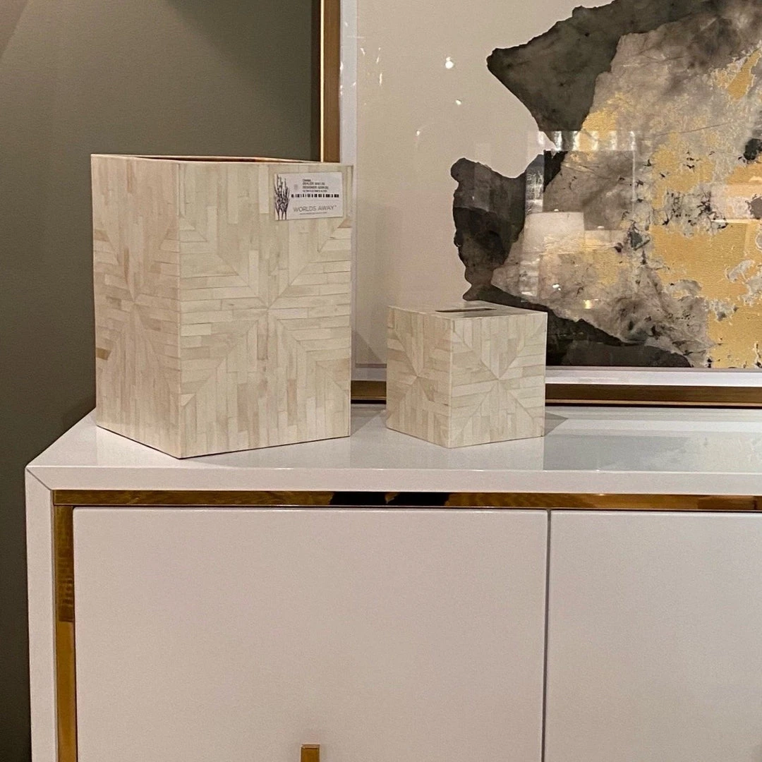 The Worlds Away Beth Tissue Box in Natural Bone captures a touch of elevated style for your home. Abstract and elegant, this contemporary accessory features a lovely natural bone finish and square shape. Place the Beth in bathrooms and offices alike. Pair with the Worlds Away Diana Wastebasket for the complete look.