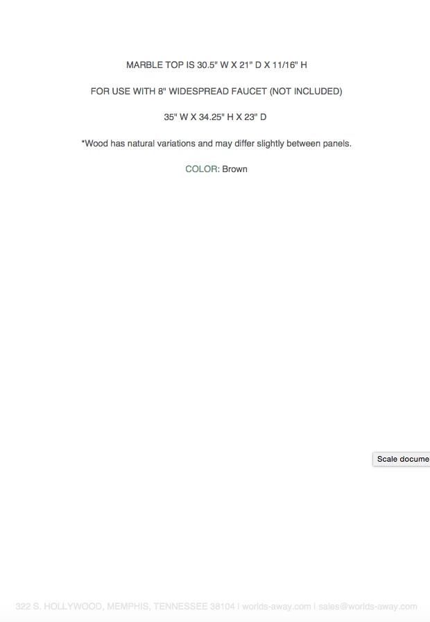 | Dimensions | 34.25" High x 35" Wide x 23" Deep; Backsplash: 4" High ; Marble Top: 11/16" High x 30.5" Wide x 21" Deep; For Use With 8" Widespread Faucet (Not Included.) |