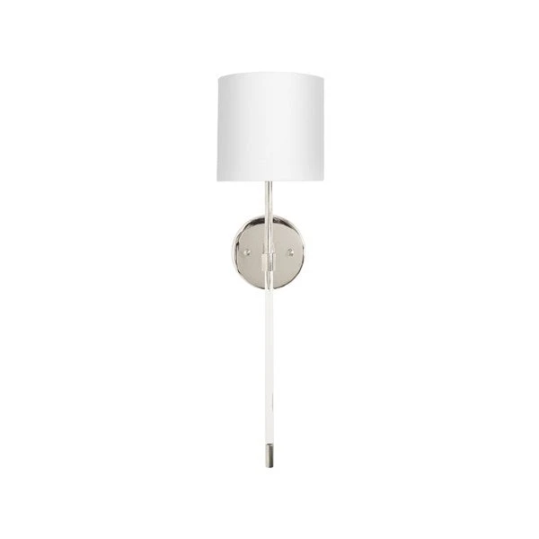 The simple acrylic Bristow Sconce features a clear design with a nickel backplate. The design works well in a bathroom or over a fireplace where a modern look is the vibe. The Bristow is topped with a standard linen shade to complete the overall feel.