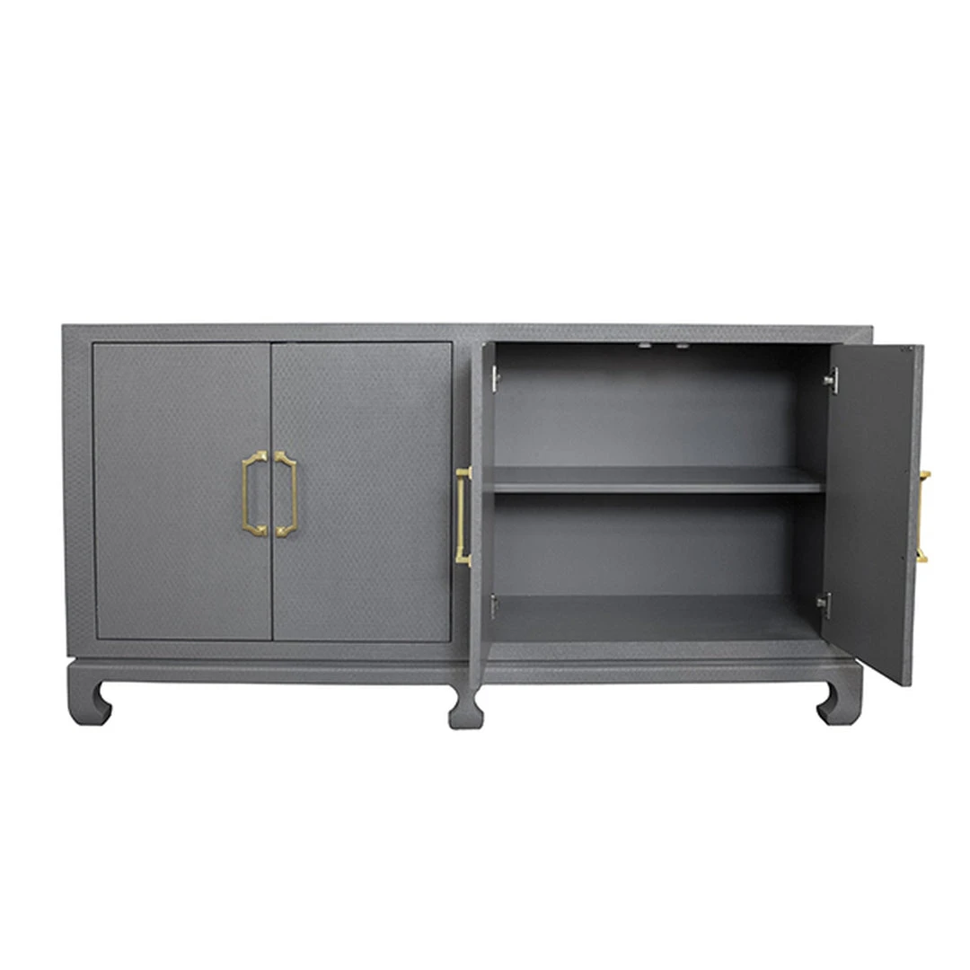 The Worlds Away Drayton Four-Door Buffet in Grey from Worlds Away features a 4 door storage piece crafted in lacquered basketweave grasscloth and accented with brass pagoda-style handles in antique brass. With two adjustable and removable shelves on both sides and tabletop surface for lamps and decorative items, the Drayton is the ideal addition to a variety of rooms in the home or office.