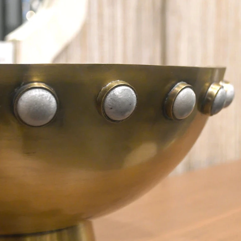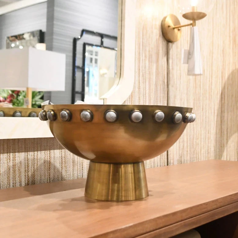 The Harvey Bowl by Worlds Away is the ultimate accessory for your home decor scheme. This round, metal bowl features a warm Antique Brass finish with sophisticated stone detail adorning the perimeter. Use the Harvey as a decorative piece on the dining room buffet or as a serving piece for your entertaining needs.