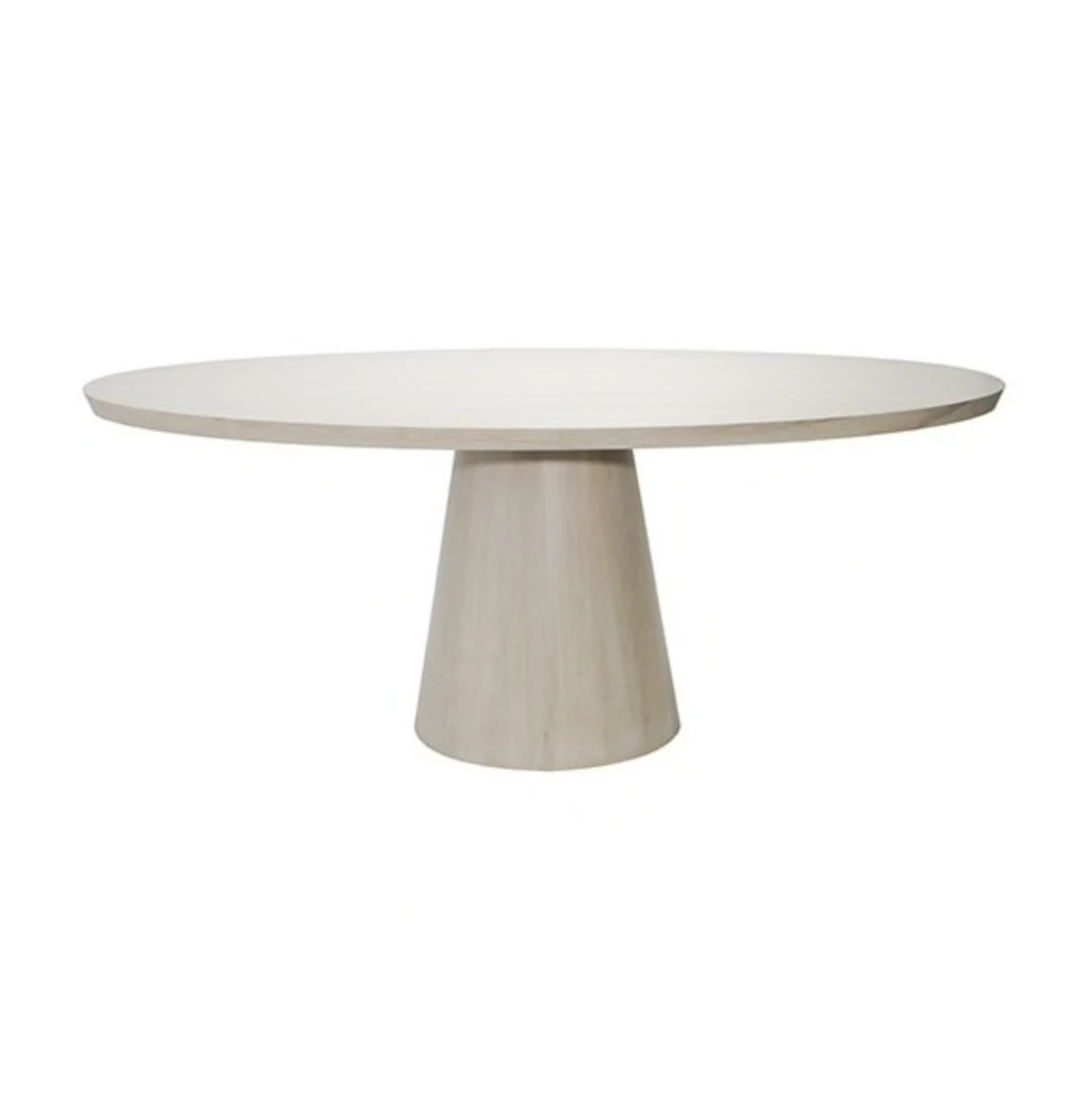 The Jefferson Dining Table from Worlds Away is a beautiful oval shape table. The light color of the cerused oak finish allows it to blend easily with other wood and metal options. Oval shaped dining tables are perfect for seating extra guests when needed. The middle base allows for free movement of legs and chairs making it ideal for entertaining.