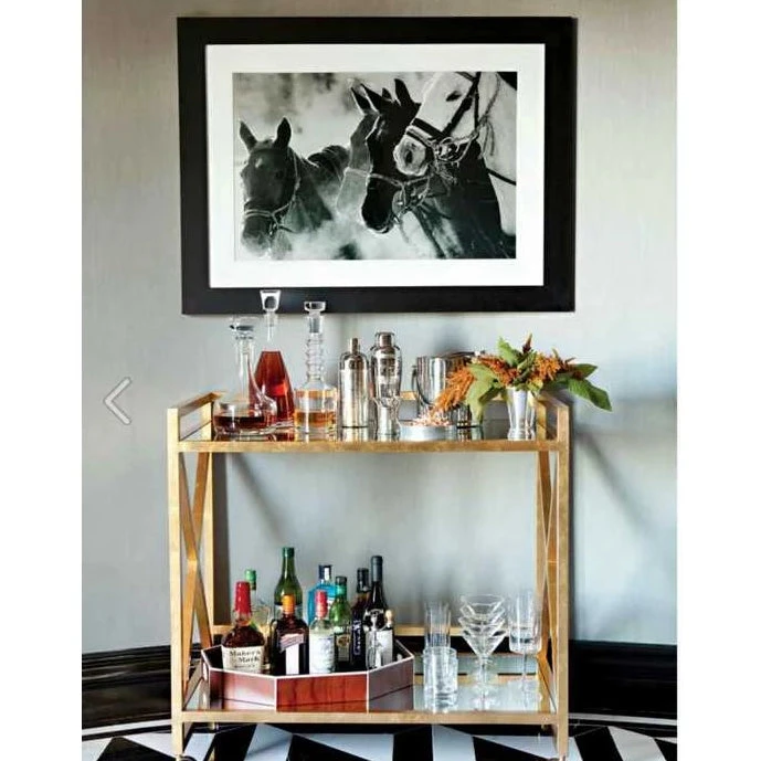 The Worlds Away Gerard Bar Cart showcases a gold leaf finished frame with X detailing on either side. Bar carts with a mirrored top and lower shelf, as seen on the Gerard by Worlds Away, accent this unique bar cart with glitz and glamour! A rolling bar cart like the modern, contemporary Gerard Bar Cart from Worlds Away delivers a conversation piece as you entertain guests.