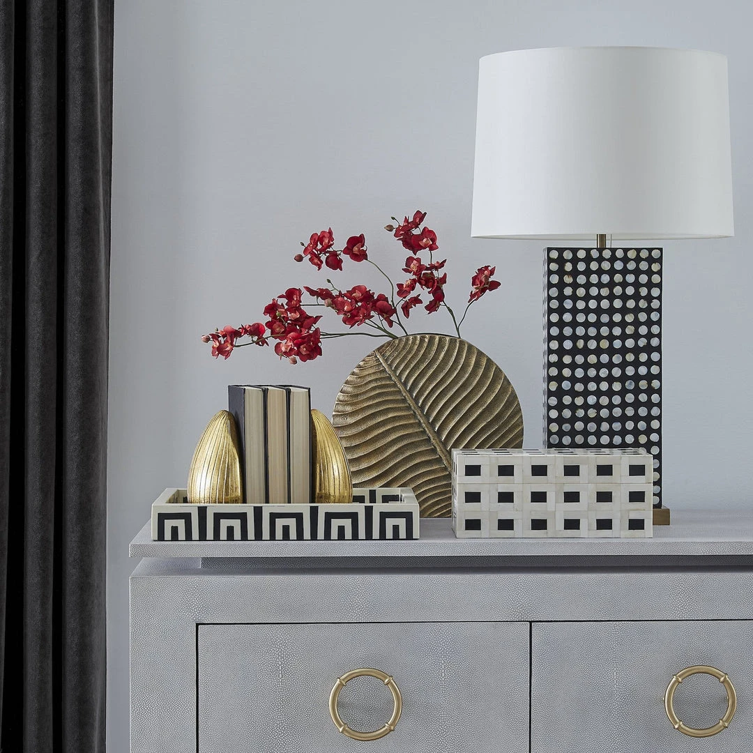 The Jordon Box from Worlds Away offers a stylish geometrically-designed storage box made of resin and natural bone. Available in two sizes, this striking lidded container is as functional as it is elegantly designed. Place the Jordon on the entryway console to store keys or on the desktop to organize all of your essentials.