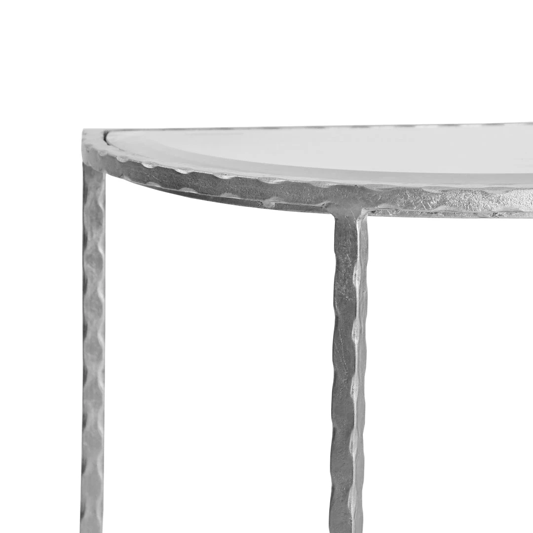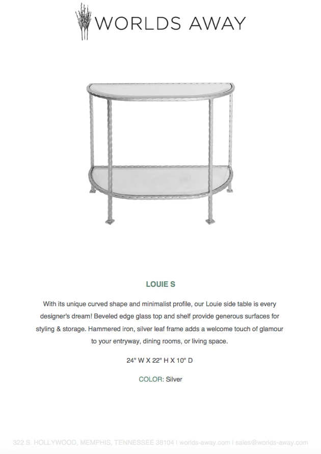 With its unique curved shape and minimalist profile, the Louie Side Table from Worlds Away is every designer’s dream! The beveled edge glass top and shelf provide generous surfaces for styling & storage. Hammered iron, silver leaf frame adds a welcome touch of glamour to your entryway, dining rooms, or living space.Â