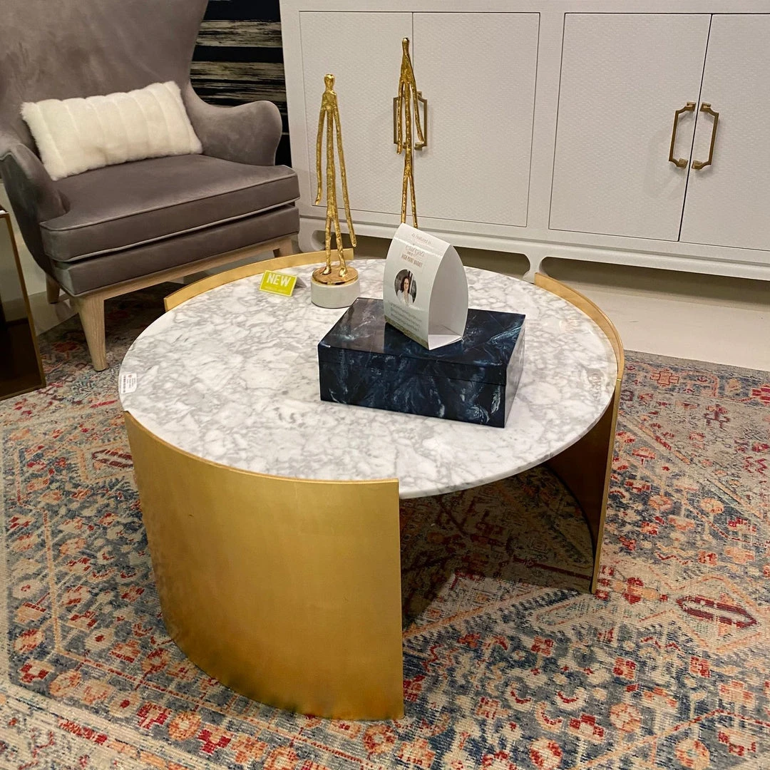 Looking for a round cocktail table with a high-style profile and durable, luxurious composition? Look no further than our extraordinary, statement-making Montana Cocktail Table in Gold Leaf from Worlds Away. Three gold leaf sculptural forms enclose a luminous white marble top, creating a look that is simultaneously grounded and gravity-defying.