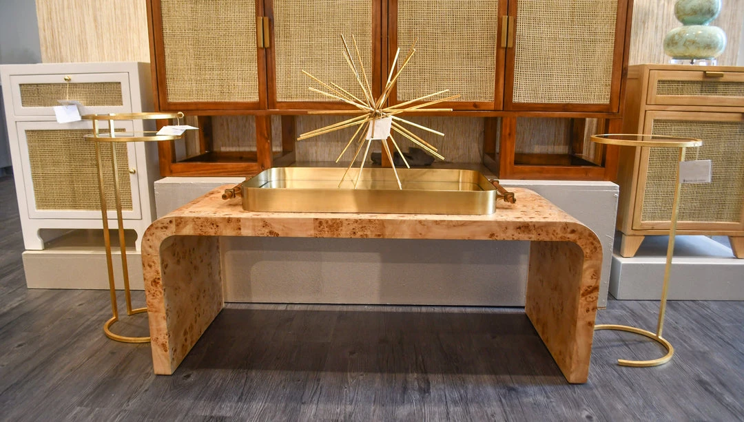 The Newbury coffee table from Worlds Away is a sophisticated yet simple coffee table. This coffee table is made of Burl Wood and known as the waterfall coffee table. Tables such as the Newbury coffee table from Worlds Away can be used as the living room coffee table for maximum style.