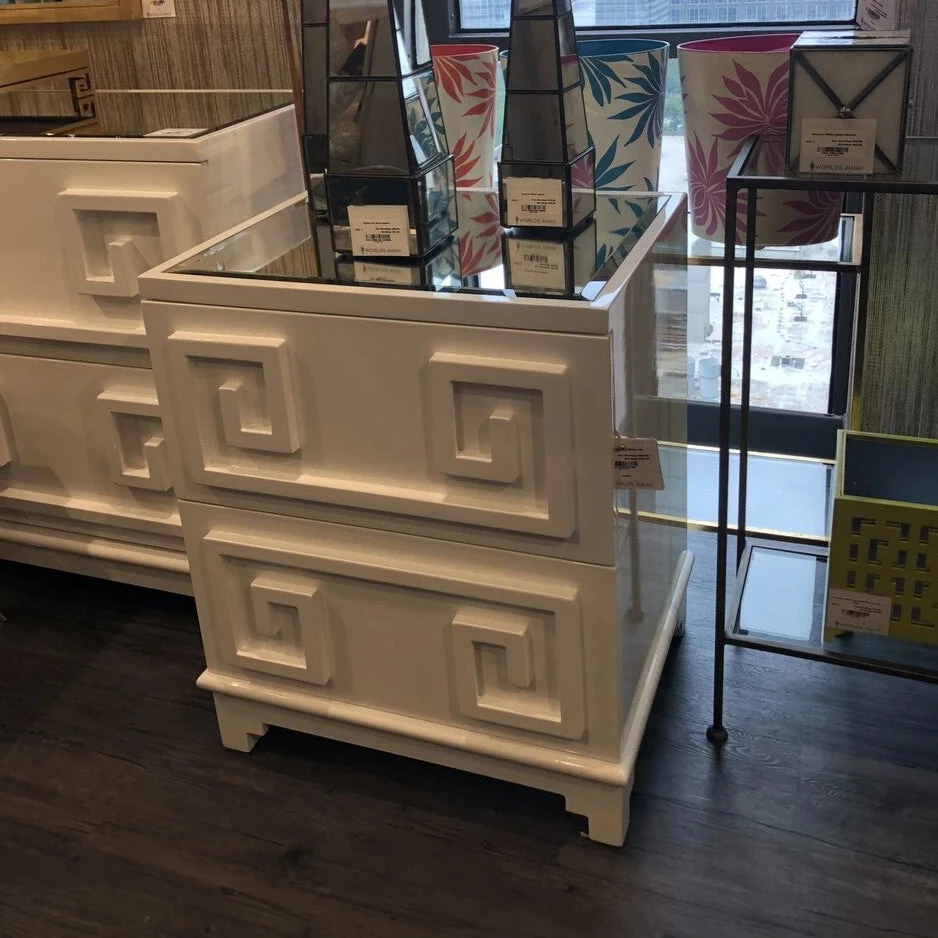 The Worlds Away Pagoda Nightstand showcases a sophisticated Greek Key design with two White lacquered, gliding drawers for storage. This bed side table from Worlds Away takes its inspiration from timeless vintage pieces. Side tables like the Pagoda Nightstand from Worlds Away deliver function and elegance for today’s  modern interiors!