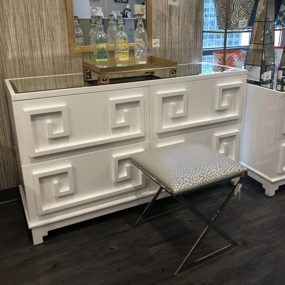 The Worlds Away Wrestler Dresser in White Lacquer features four drawers for storage. This cabinet, inspired by Greek Key design, complements a myriad of decor styles and can be used in several different areas of the home. The ultimate in sophistication, the Wrestler Dresser from Worlds Away works well in foyers, dining rooms, master suites, and offices!